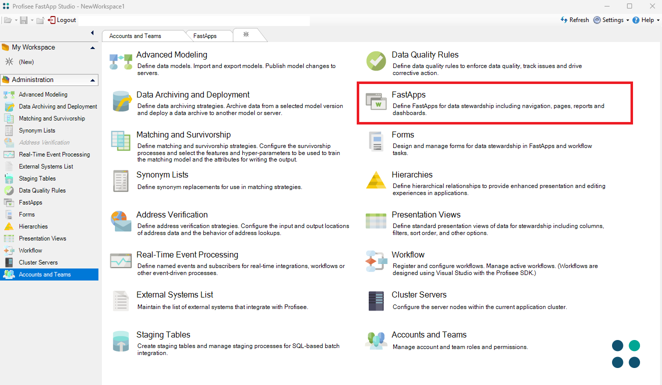 FastApp Studio에 로그인하고 Profisee에 대한 MDM 관리 및 구성 관리의 나머지 부분을 수행합니다. 설치하는 동안 제공된 관리자 이메일 주소로 로그인하면 입니다. Profisee FastApp Studio의 왼쪽 창에서 관리 메뉴를 볼 수 있어야 합니다. 이러한 메뉴로 이동하고 FastApp 도구를 사용하여 MDM 여정의 나머지 부분을 수행합니다. 아래 이미지에 표시된 대로 관리 메뉴를 볼 수 있게 되면서 Azure Platform에서 Profisee를 성공적으로 설치할 수 있습니다.