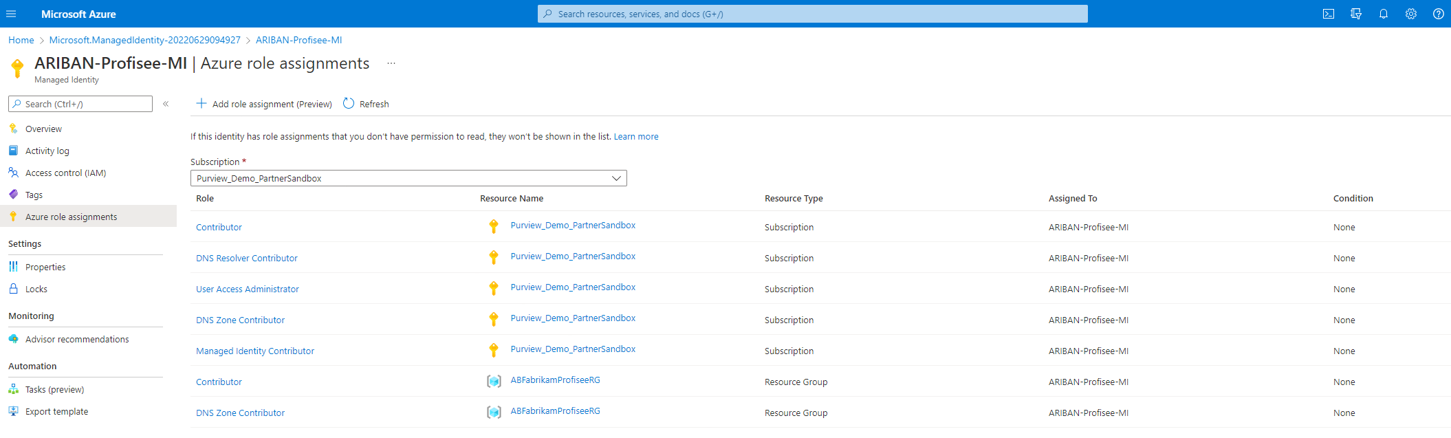- 구독 수준에서 관리 ID 기여자 및 사용자 액세스 관리자. ARM 템플릿 관리 ID가 Profisee에서 Key Vault 저장된 값을 끌어오는 데 사용할 Key Vault 특정 관리 ID를 만들려면 필요합니다.