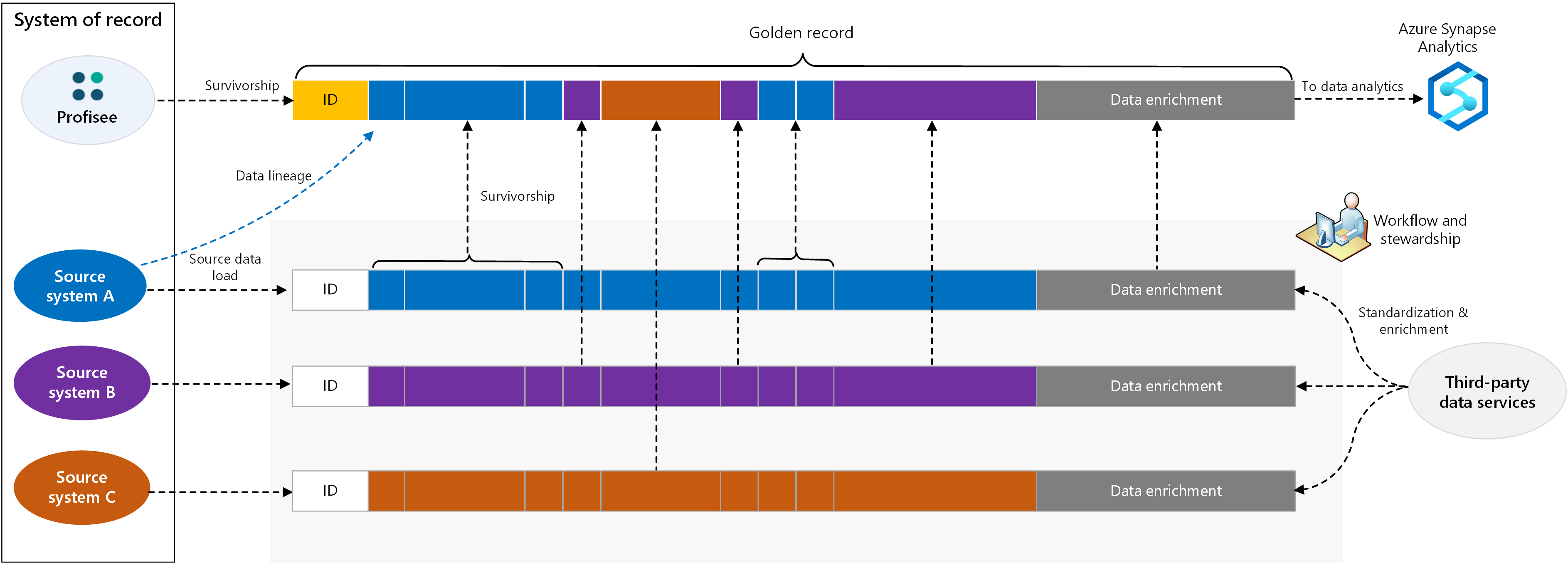 Profisee MDM 기록 및 감사 추적 하위 시스템은 사용자가 수행한 변경 내용을 추적합니다. 이 하위 시스템은 또한 생존자와 같은 시스템 프로세스의 변경 내용을 추적합니다. 일치 및 생존자를 사용하면 원본 레코드에서 master 정보 흐름을 추적할 수 있습니다. Profisee MDM에는 특정 원본 레코드를 담당하는 원본 시스템의 레코드가 있습니다. 또한 서로 다른 원본 레코드가 골든 레코드를 채우는 방법도 알고 있습니다. 결과적으로 분석에서 보고서가 참조하는 원본 데이터로 데이터 계보를 얻을 수 있습니다.