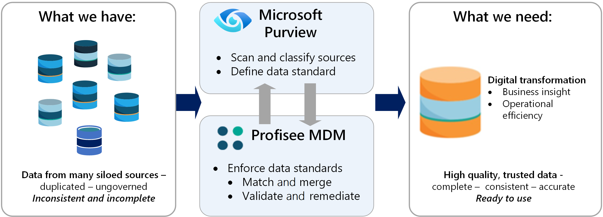 Azure 데이터 자산에 고품질 데이터가 없으면 Azure의 비즈니스 가치가 훼손될 수 있습니다. 이 솔루션은 고품질의 신뢰할 수 있는 데이터에 대한 진리 소스를 생성하고 제공할 수 있는 데이터 거버넌스 및 관리를 위한 기반을 구축하는 것입니다. Microsoft Purview 및 Profisee MDM은 함께 작동하여 이 엔터프라이즈 플랫폼을 형성합니다.