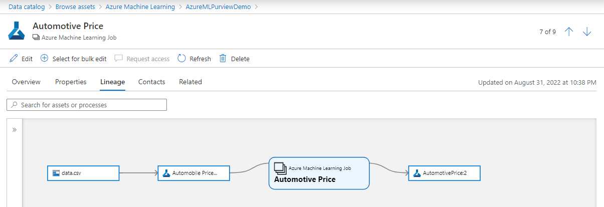 계보 정보를 보려면 자산을 선택한 다음 계 보 탭을 선택합니다. 계보 탭에서 해당하는 경우 자산의 관계를 볼 수 있습니다. 사용된 원본 데이터(Purview에 등록된 경우), Azure Machine Learning에서 만든 데이터 자산, 모든 작업 및 최종적으로 결과 기계 학습 모델을 확인할 수 있습니다. 고급 시나리오에서는 다음을 확인할 수 있습니다.