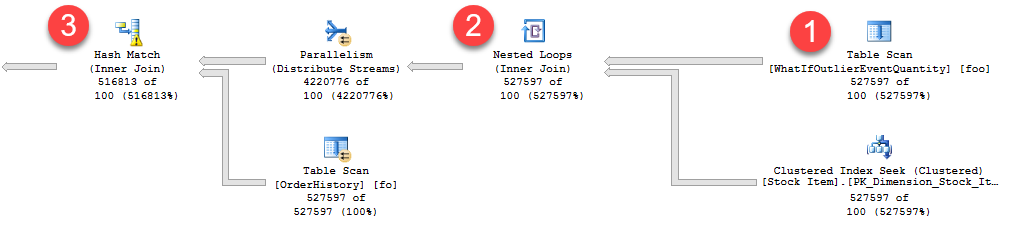 - MSTVF 테이블 검색의 고정 예상 행 수는 100개입니다. 하지만 이 예제의 경우 100개의 527597이라는 실제 예상을 통해 라이브 쿼리 통계에서 보듯이 이 MSTVF 테이블 검색을 통해 527,597개의 행이 흐르므로 고정 예상치가 크게 왜곡됩니다.
