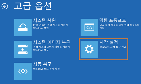 6. 고급 옵션창이 나타나면, 시작 설정을 클릭합니다.