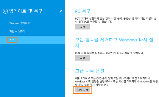 - 업데이트 및 복구 창으로 이동되면, 항목 중 복구 항목을 클릭하고 우측 메뉴에서 고급 시작 옵션 항목의 다시 시작 버튼을 클릭합니다.