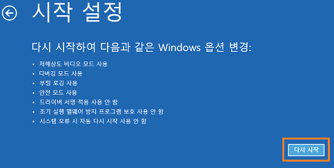 7. 시작 설정 창이 나타나면 우측의 다시 시작 버튼을 클릭합니다.
