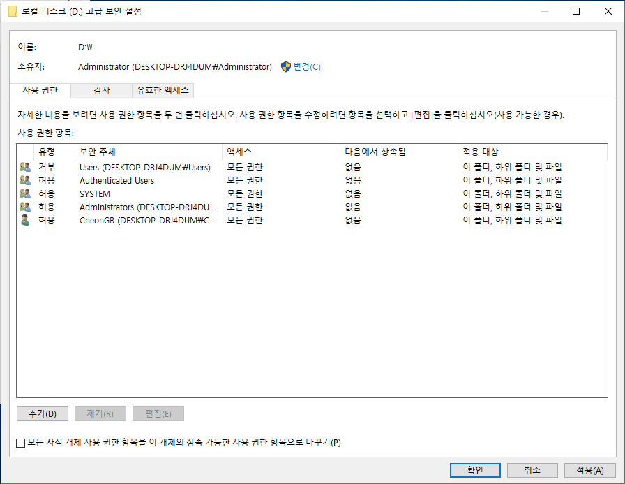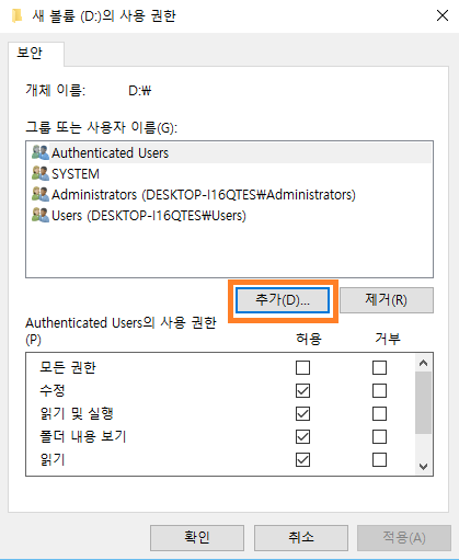 6. 다시 드라이브를 마우스 오른쪽 버튼으로 클릭하여 [속성 - 보안 탭]으로 이동한 후 사용 권한 창의 보안 탭에서 편집 버튼을 클릭하고 추가 버튼을 클릭합니다.