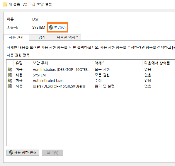 3. 고급 보안 설정 창이 나타나면 소유자 항목의 "변경"을 클릭합니다.