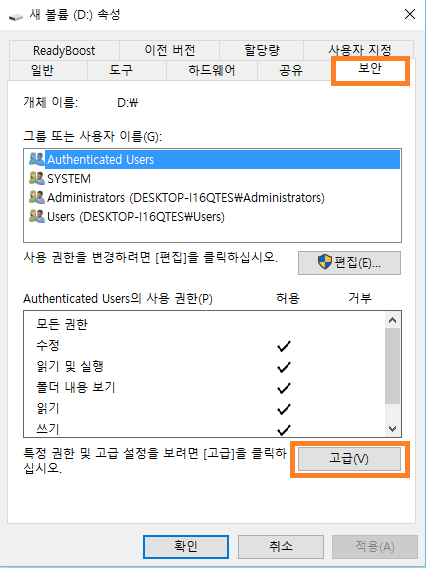 2. 속성 창에서 보안 탭으로 이동한 후 고급 버튼을 클릭 클릭합니다.