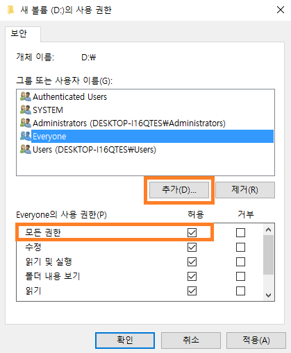8. Everyone이 추가되면 Everyone을 클릭하고 "모든 권한 허용"에 체크한 후 확인 버튼을 클릭합니다.