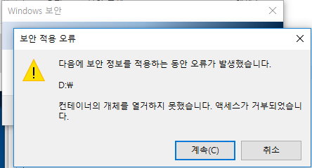 Windows 10 사용 중에 D: 드라이브에 보안 적용 오류 메시지가 발생하는 현상으로 문의하셨습니다.