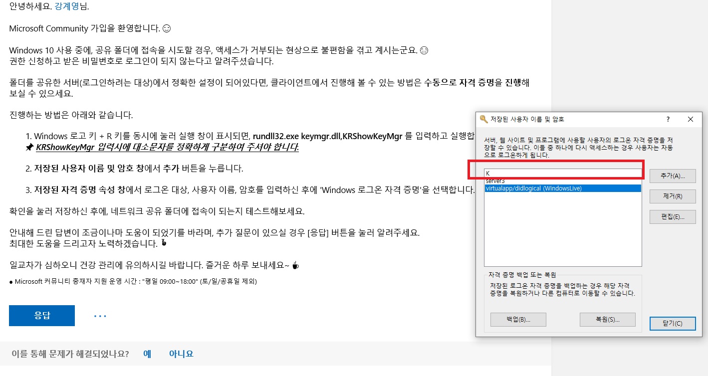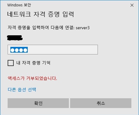 폴더를 공유한 서버(로그인하려는 대상)에서 정확한 설정이 되어있다면, 클라이언트에서 진행해 볼 수 있는 방법은 수동으로 자격 증명을 진행해 보실 수 있으세요.