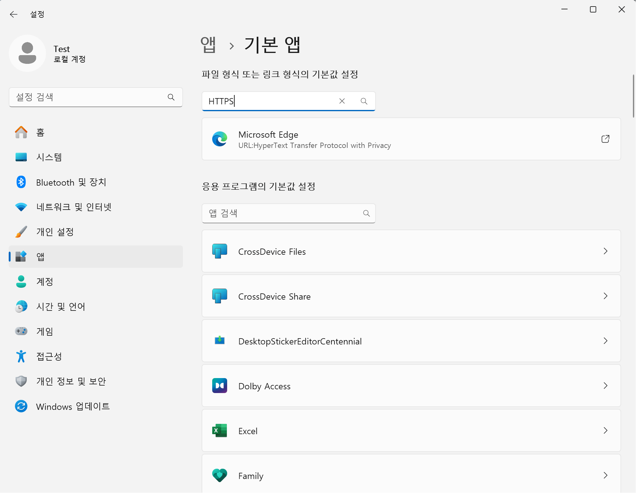 검색 상자에 'HTTPS'를 입력하여 기본 응용 프로그램이 Edge로 설정되어 있는지 확인합니다. 그렇지 않다면 Edge를 클릭하고 기본값으로 설정하세요.