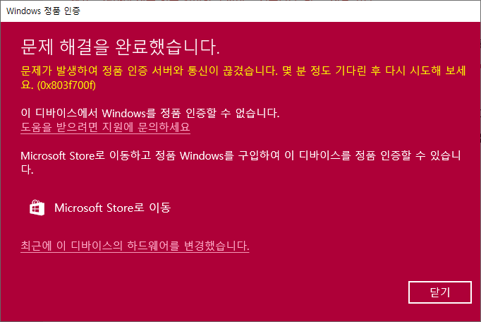 문제 해결사는 시스템의 하드웨어 변경이 이루어 졌다고 언급했습니다.