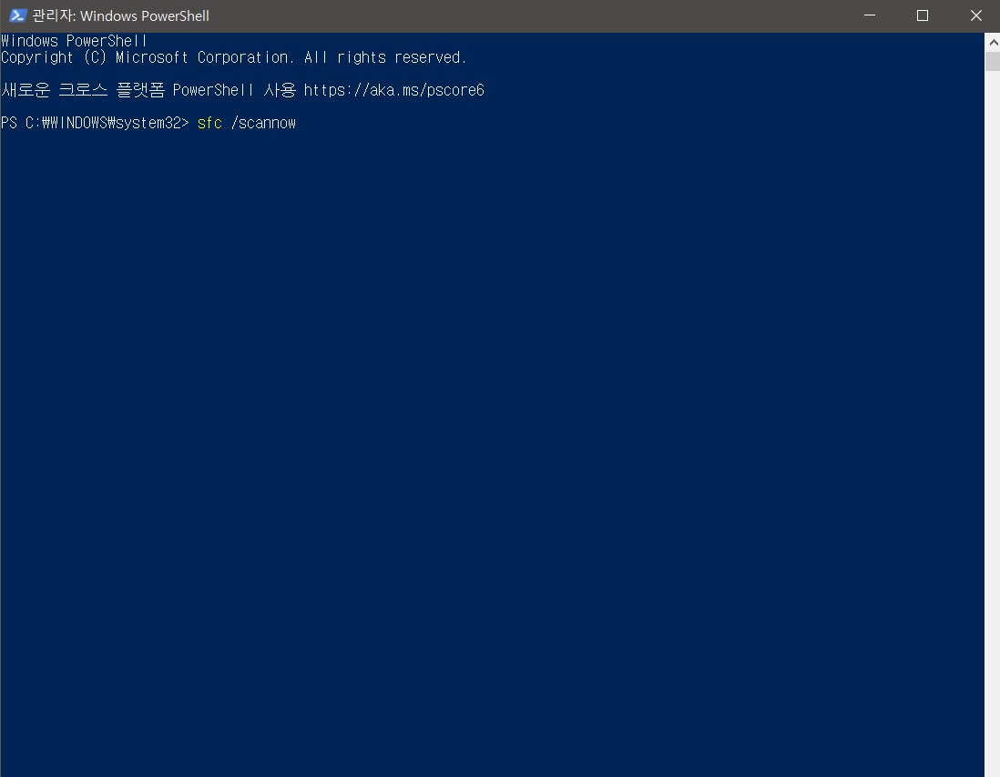 보이는것 처럼 sfc /scannow 명령어를 입력해도 아무런 반응이 없습니다.