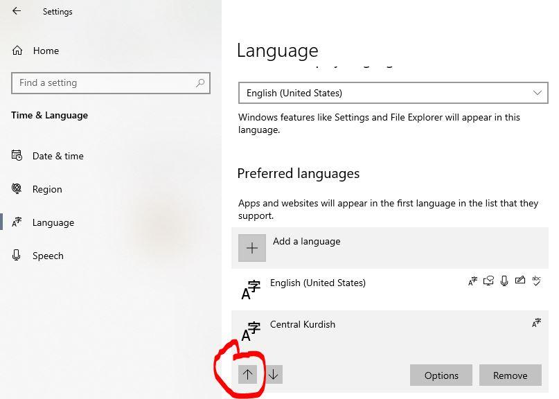 > 설정 > 시간 및 언어 > 언어 >> 클릭하여 첨부된 이미지에 표시된 대로 한국어 입력 언어의 UP 화살표를 클릭하여 목록의 첫 번째 설정으로 이동합니다.