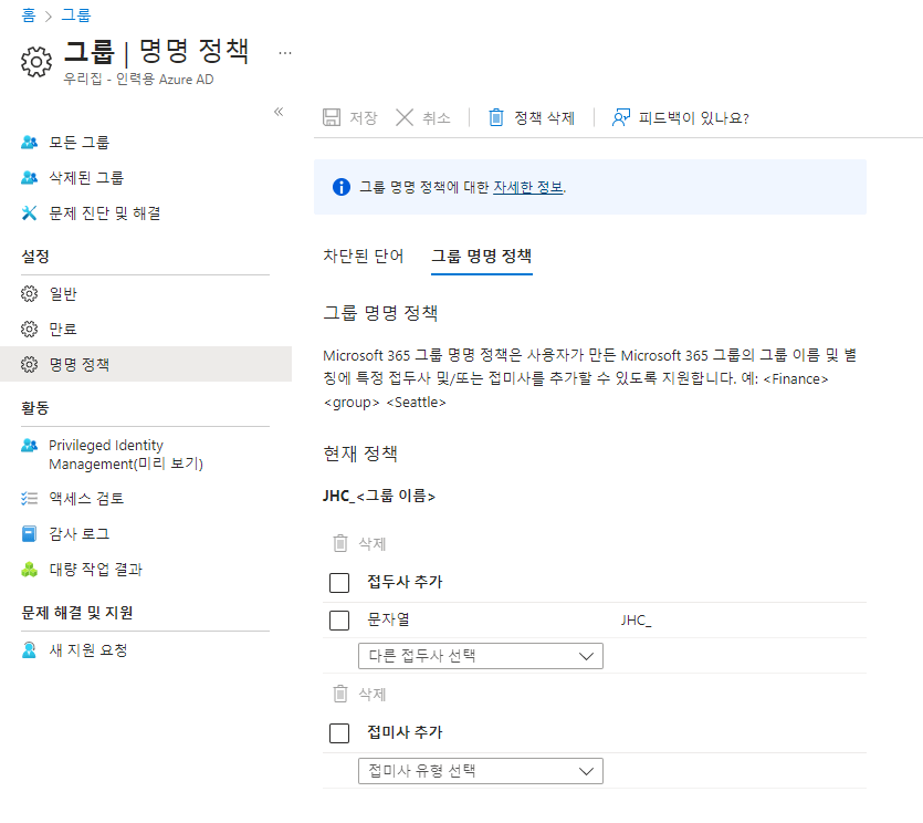 Microsoft 365 그룹에 Azure AD 명명 정책을 사용하려면 하나 이상의 Microsoft 365 그룹의 구성원인 각 고유 사용자에 대해 Azure Active Directory Premium P1 라이선스 또는 Azure AD Basic EDU 라이선스를 소유해야 하지만 반드시 할당해야 하는 것은 아닙니다.