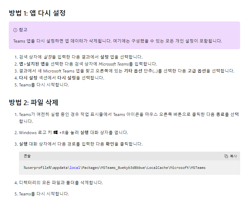 참고로: Teams 캐시 지우기 - Microsoft Teams | 마이크로소프트 런