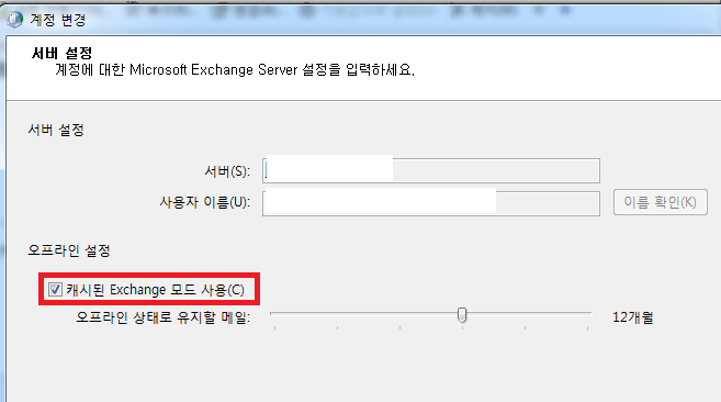 먼저 사용하시는 *.OST(오프라인 캐시 파일)의 경우 사용하지 않음으로 설정할 수 있습니다.