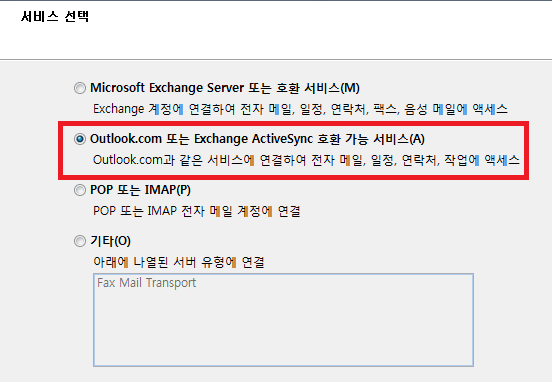 Outlook.com 계정이라면, Exchange ActiveSync로 계정을 설정해 주셔야 합니다.