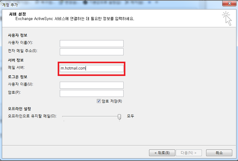 - 메일 서버에 m.hotmail.com으로 입력하고 나머지 로그인 정보를 직접 입력해 주시기 바랍니다.