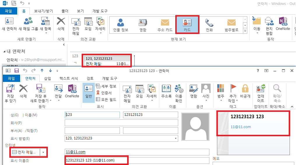 상단의 현재 보기 상태를 [카드]로 변경한 후 문제가 발생되는 사용자를 찾아서 더블 클릭하면, 아래와 같이 [표시 형식]과 [전자 메일] 주소를 변경할 수 있습니다.