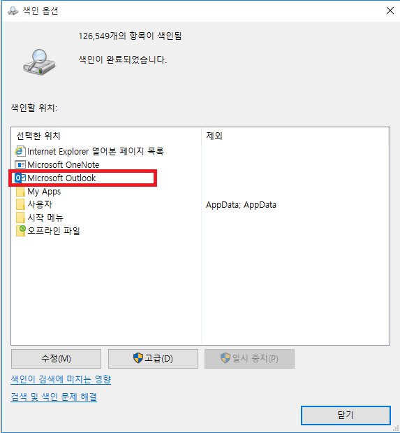 문의 하신 Outlok에서 검색이 되지 않는 문제에 대해 안내를 드리겠습니다.