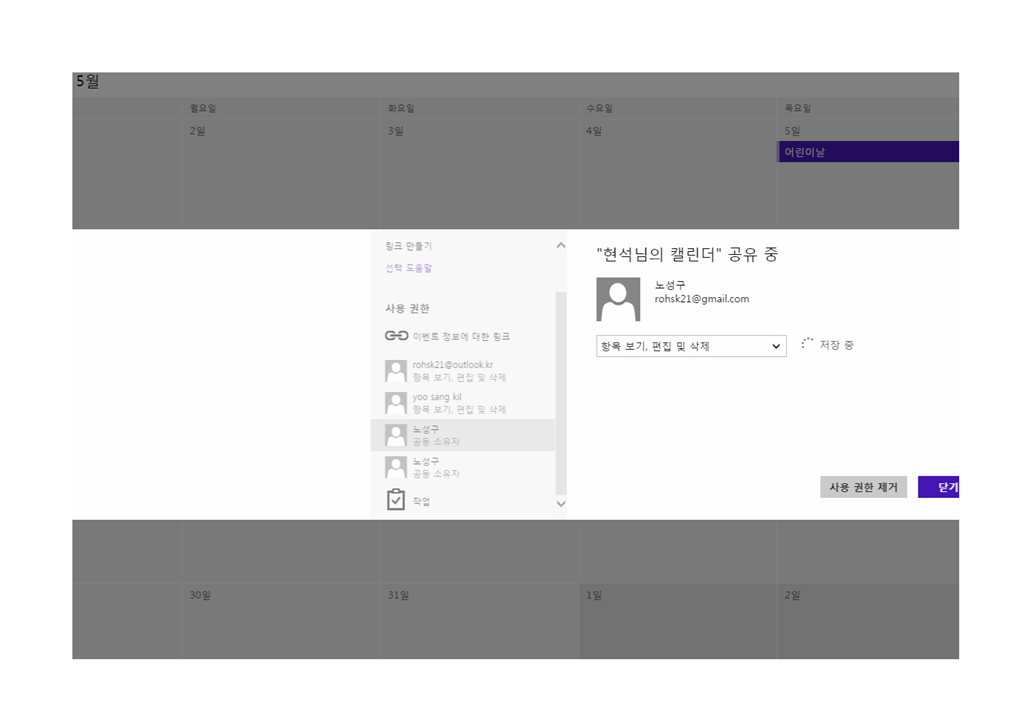 따라서 **Outlook.com** **캘린더**를 공유하는 사용자와 공유 받는 사용자 계정이 모두 웹용 Outlook 계정일 경우에만 가능한 것으로 확인되었습니다. 번거로우시겠지만 2016년 8월 말까지는 모든 사용자가 웹용 Outlook으로 업그레이드 될 예정이므로, 웹용 Outlook으로 업그레이드된 후 **Outlook.com** **캘린더**의 공유 권한을 변경하시기를 권장해드립니다.