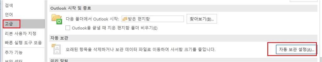아웃룩 옵션에서 --> 고급 항목을 클릭 하시면 "자동 보관" 항목이 보입니다.