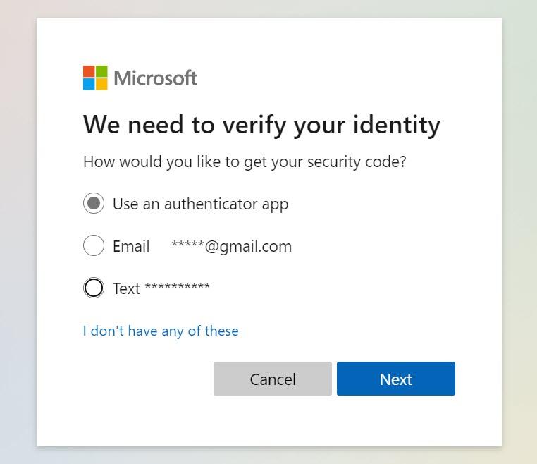 - 텍스트 상자에 이메일 주소를 입력> 다음 > 선택 "다른 확인 옵션 사용"> 거기에 나열된 다른 확인 방법을 선택합니다. (스크린샷 참조)