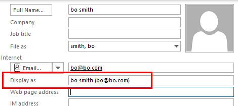 연락처를 저장할 때 이메일 표시 이름에 이름과 주소가 있는지 확인합니다.