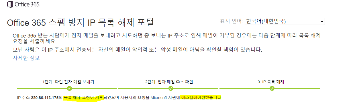 목록 해제 포털(https://sender.office.com/)을 사용해 보십시오. https://learn.microsoft.com/microsoft-365/secur... 보기