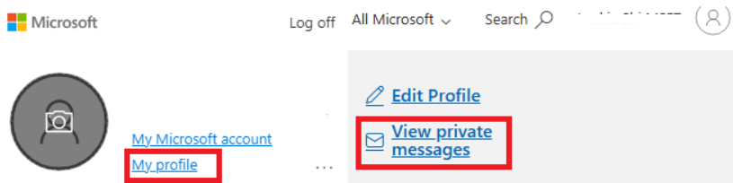 개인 메시징 옵션을 보려면 Microsoft Community에 로그인> Microsoft Community 에 이 스레드 정보를 게시한 전자 메일 계정을 사용한 > 오른쪽 위에 있는 프로필 사진을클릭한 > 내 프로필옵션을 선택합니다.