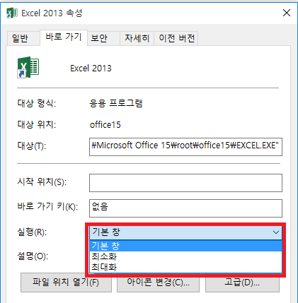 먼저 Excel 실행 아이콘/실행 파일의 [속성]에서 "실행" 설정이 최소화로 되어 잇는지 확인해 주시기 바랍니다.