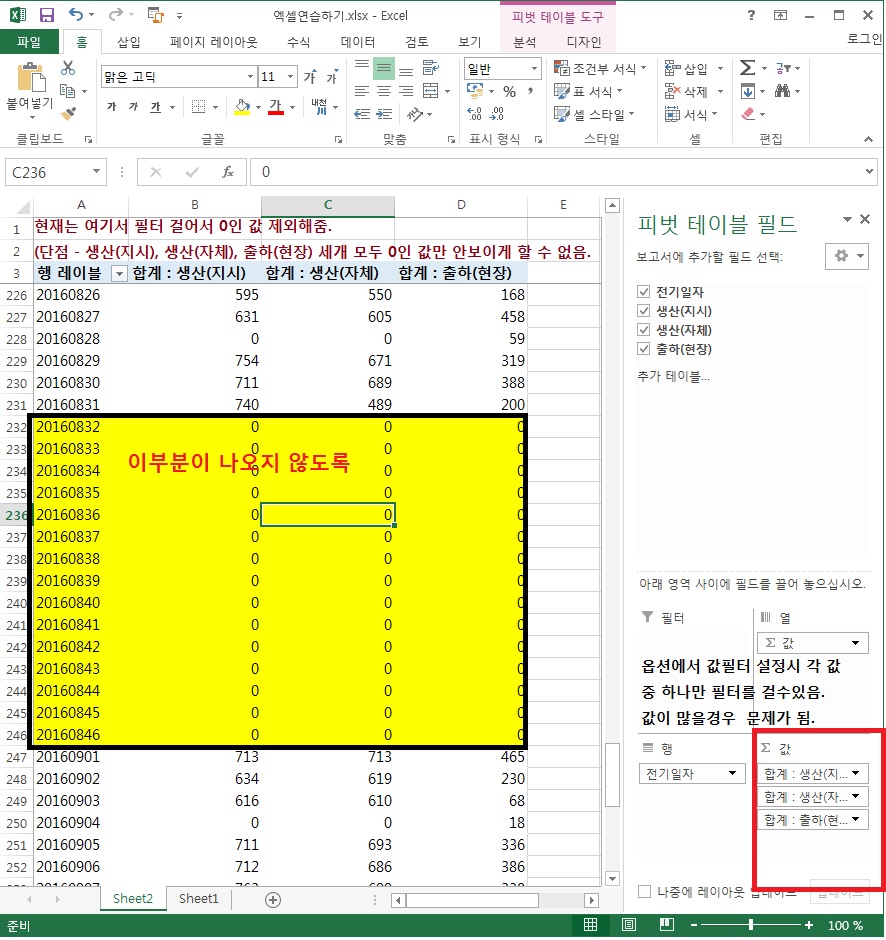 Excel 피벗 테이블에서 '0' 값 표시 숨기는 부분에 대해서 문의해 주셨습니다.