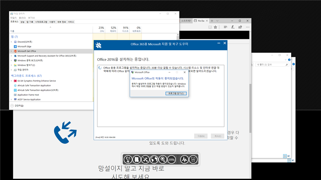 이후 https://portal.office.com에 로그인 후 다시 설치를 해 보시기 바라며, 해결이 되지 않는다면, 관리자 계정 확인 후 Office 365 기술지원팀(080-495-0880 연결 번호 1)으로 문의하시기 바랍니다.