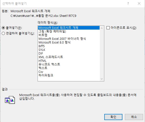 다른 파일에 붙여넣기를 하면 "선택하여 붙여넣기 옵셥이"