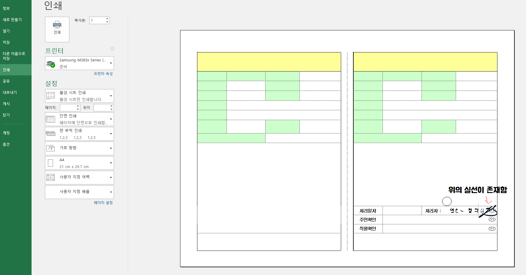 인쇄 미리 보기에 선이 나타나는지 확인합니다.
