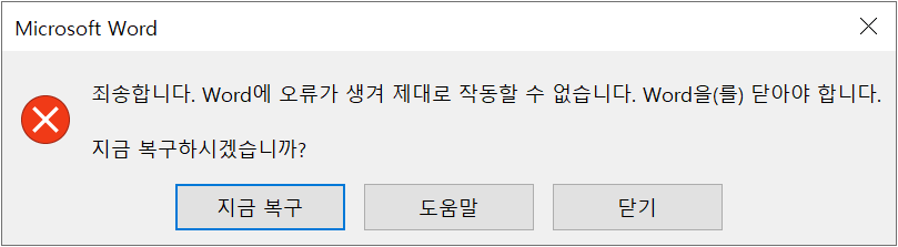 말씀하여 주신 메시지가 나오면서 실행이 안될 때 Word프로그램 창의 상단부를 보시면 ‘사용 허가되지 않은 제품’ 이라고 나오는 상황인지요? 만약 그렇다면 현재 프로그램이 인증이 풀린 상태로 보이며 인증 지원이 필요하실 것입니다.