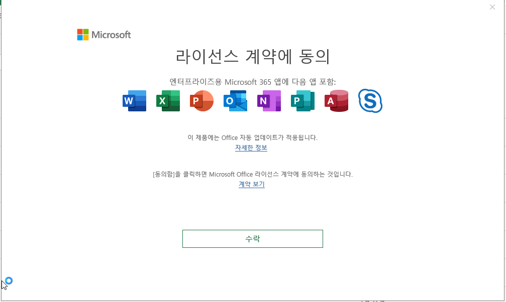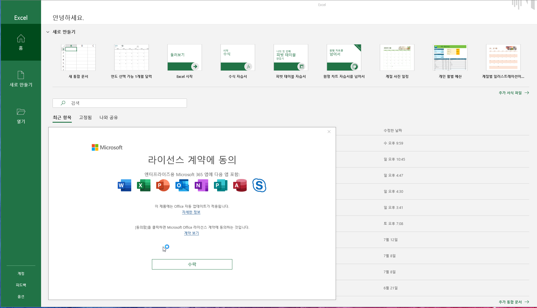 왜 엔터프라이즈용 앱이 포함된 버전에 대한 라이섵스 계약에 동의에 대한 수락을하라고 하는지요?