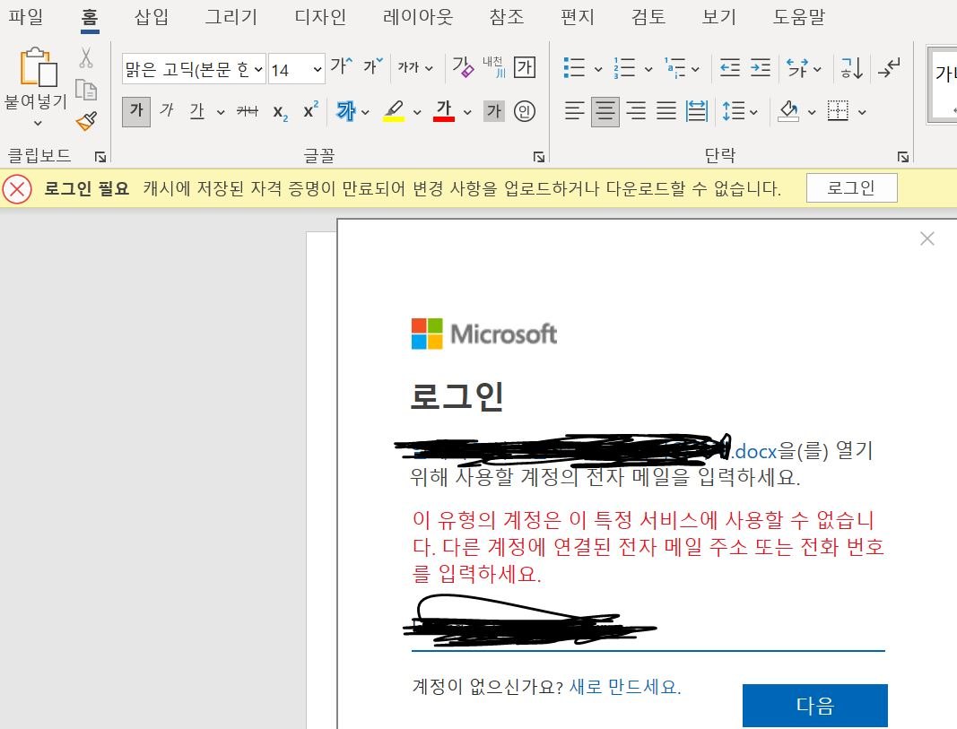 설명해 주신 증상의 경우 Office 앱에 로그인된 계정 정보가 만료되거나 손상되어 발생합니다.