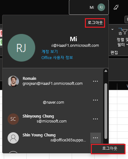 먼저, Office 앱(Excel, Word, PowerPoint 중 아무 앱이나 상관 없습니다)을 실행한 뒤 우측 상단의 계정을 클릭하고 보이는 모든 계정을 로그아웃 시킵니다.