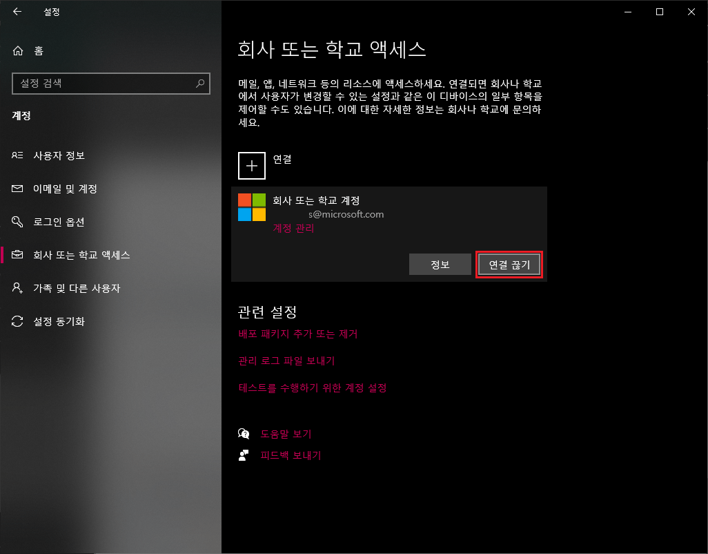 마지막으로, Windows 설정 - 계정 - 회사 또는 학교 액세스 메뉴에서, 연결되어 있는 모든 계정에 대해 '연결 끊기'를 진행해 줍니다.