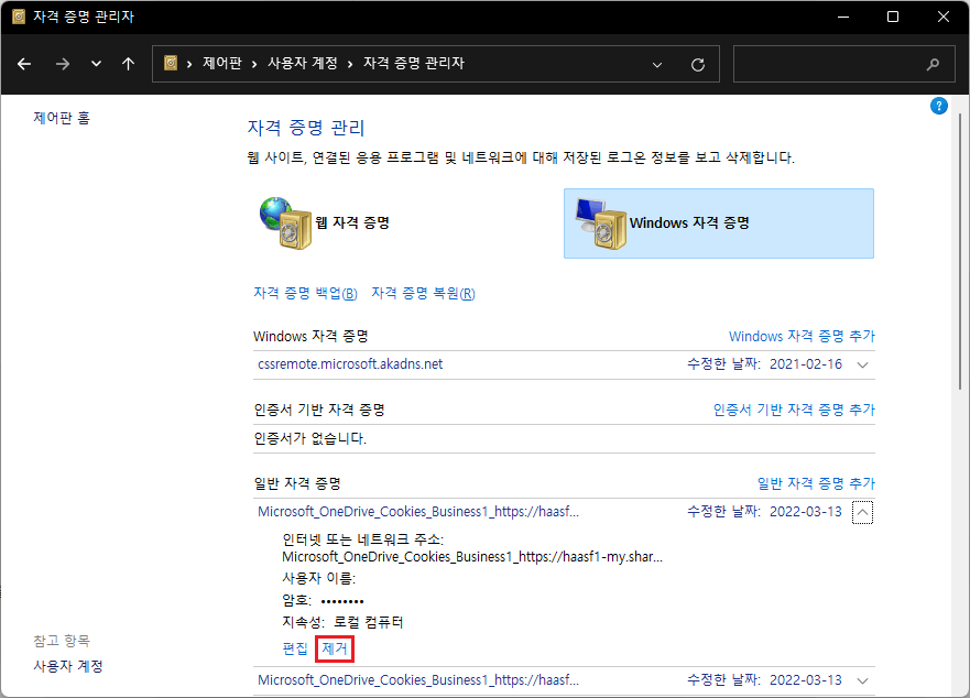 또한, 제어판 - 사용자 계정 - 자격 증명 관리자 - Windows 자격 증명 탭에서, 관련된 일반 자격 증명을 모두 제거합니다. 확신이 없는 경우 일반 자격 증명 정보들을 모두 제거하셔도 무방합니다. 이 정보들은 앱들에서 자동 로그인 등에 사용되는 정보로, 제거하더라도 해당 정보를 이용한 앱에서 로그인을 다시 해야 하는 것 외에 별다른 부작용은 없습니다. 이 작업은 문서 등 데이터를 삭제하는 작업이 아닙니다.