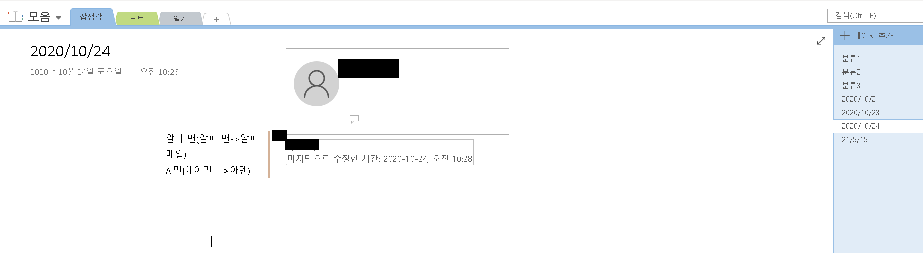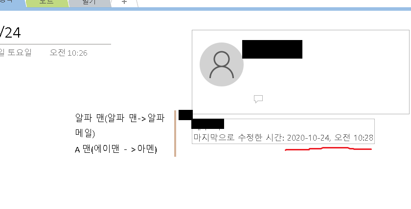 현재 문의주신 부분은 OneNote에서 기본적으로 마지막 수정 날짜에 대한 내용만 제공을 하고 있기 때문에 수동으로 따로 입력을 진행해주셔야 합니다.