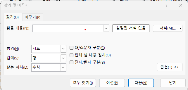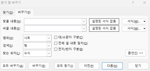 엑셀의 찾기 및 바꾸기 창을 열면