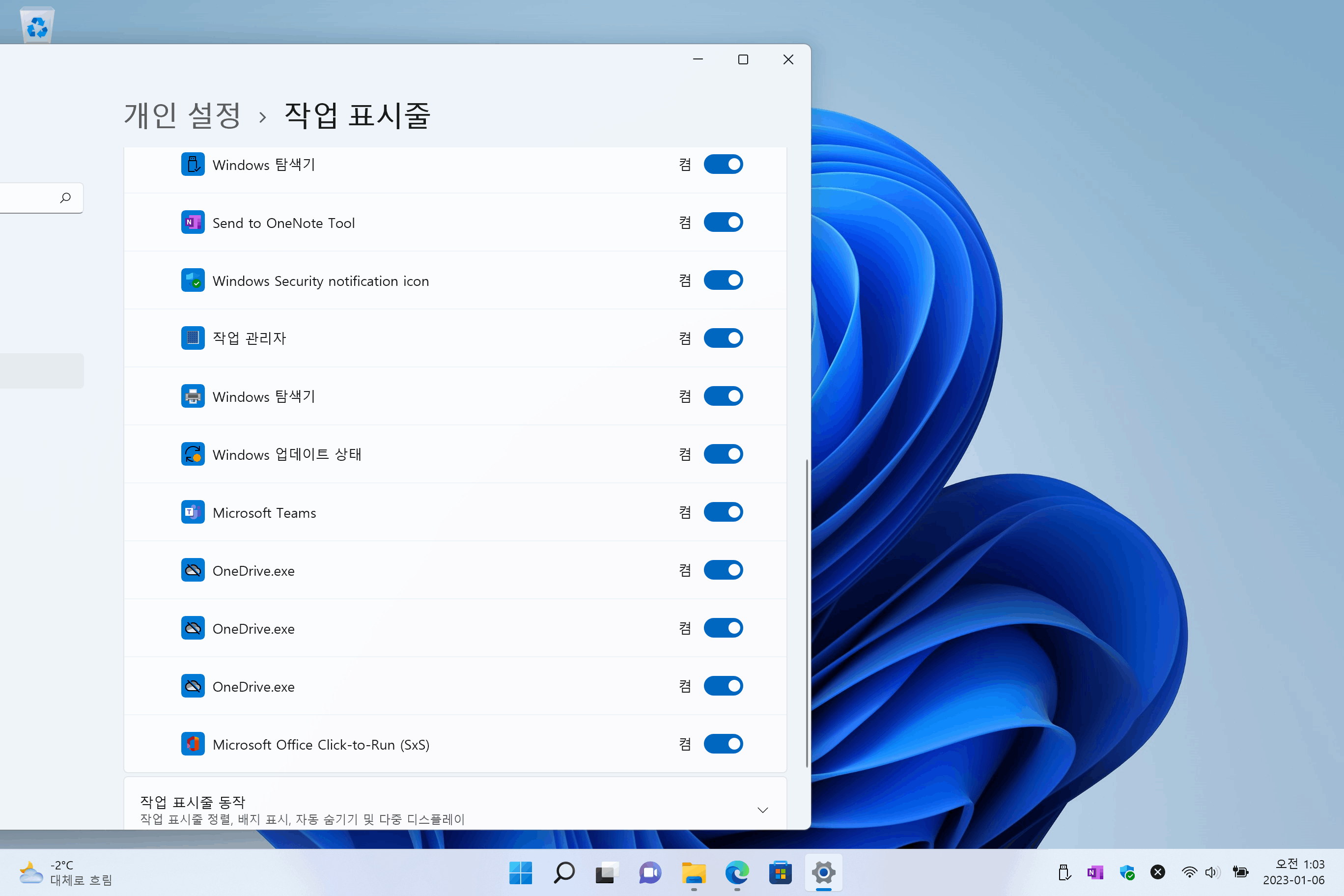 오피스 설치시 자동 설치되는 onedrive 아이콘이 보여지지 않고 활성화가 안되는것처럼 보이는것인지