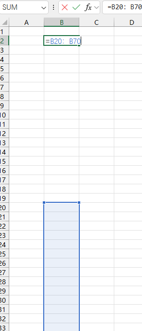 둘째, A 열에서 50 개의 항목을 간헐적으로 선택하면 B 열에서 직접 동일한 셀 행을 선택할 수 없으며 연속 셀 인 경우 동일한 방법을 사용하여 수동으로 입력 할 수 있습니다 (예 : B20 : B70).