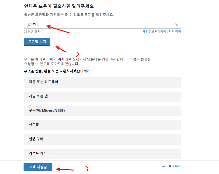 - 검색 상자에 질문을 입력합니다. 예를 들어, 환불이 있습니다.