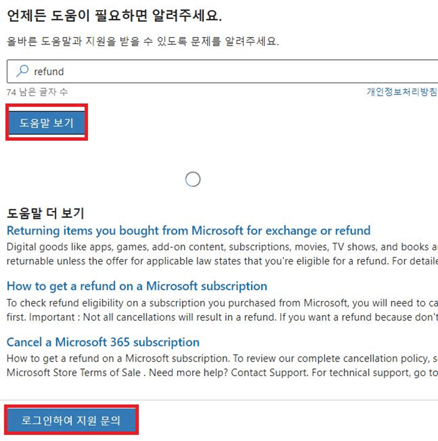 2.지정된 기간(일) 이후에 환불을 받는 데 문제가 있는 경우 Microsoft 지원 팀에 문의하세요.