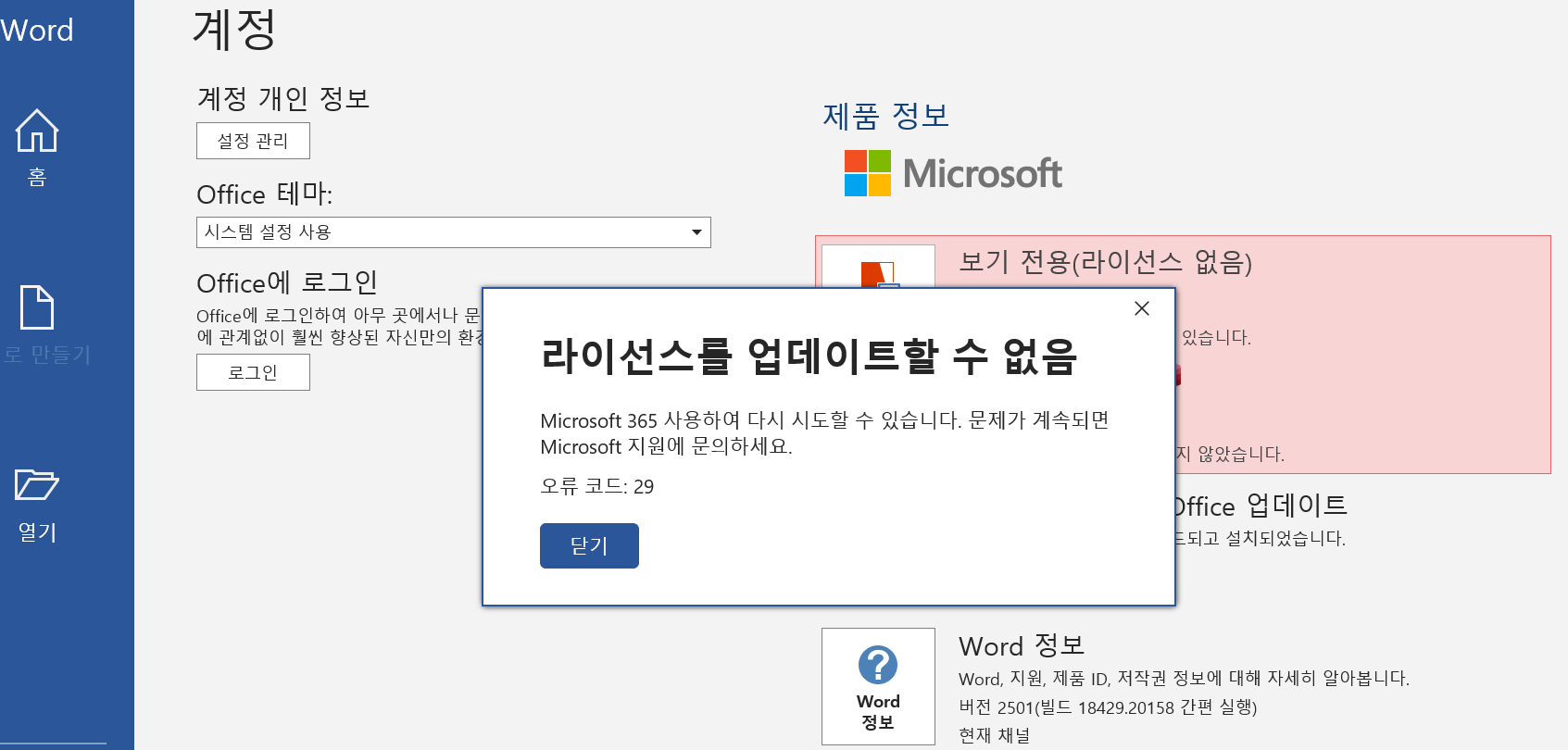 파일 > 계정 > Word 정보를 클릭하여 현재 버전의 Word를 확인할 수 있습니다